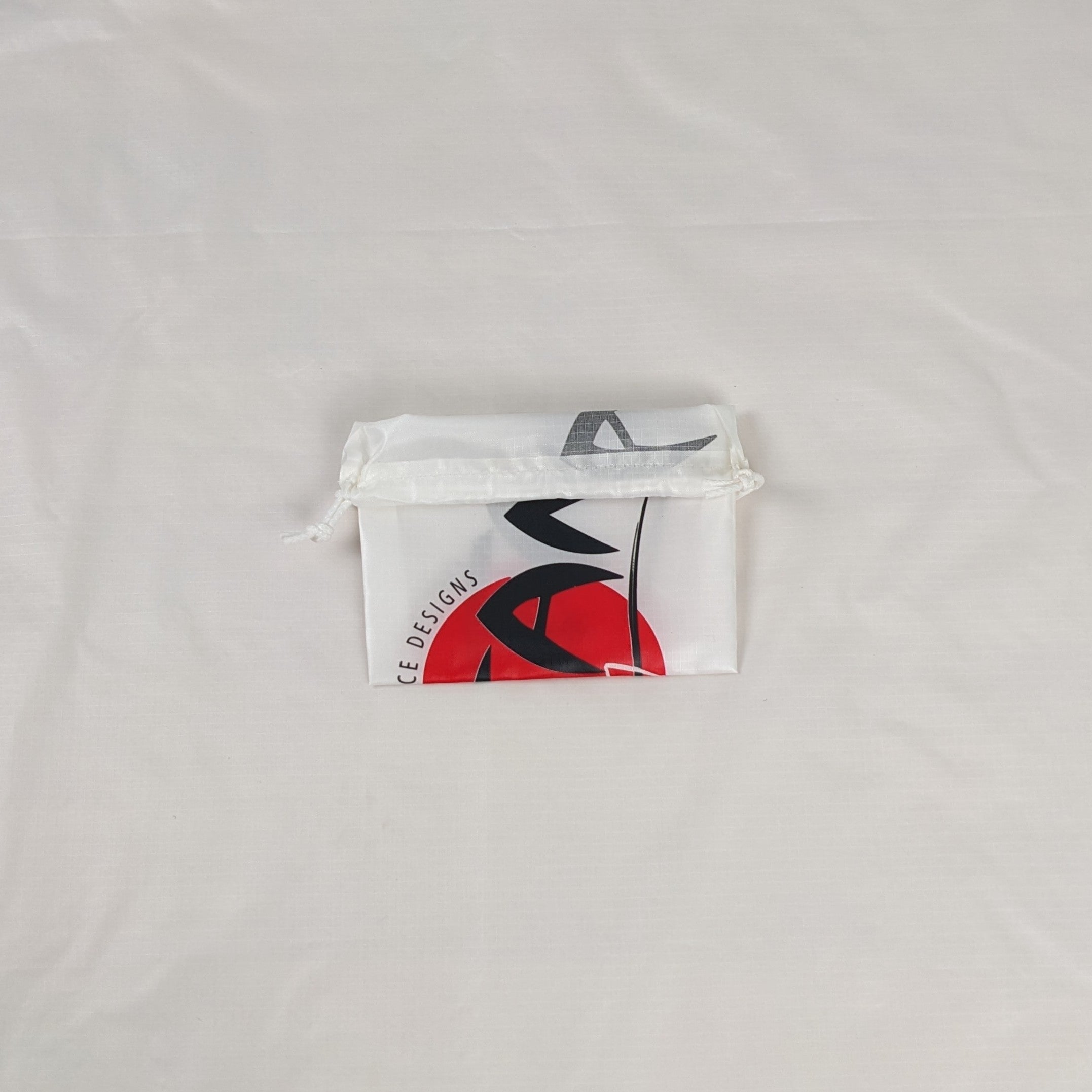 A small 4 3/4" wide, 4" high drawstring bag made from a repurposed Katana parachute logo.
